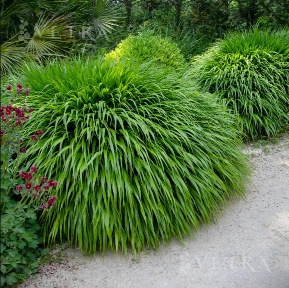 Родом из горных лесов Японии, этот злак покоряет своей уникальной, струящейся формой. Его изящные, дуговидно изогнутые листья образуют плотные каскады, напоминающие пенящиеся потоки воды или зелёный водопад, ниспадающий с камней. Хаконехлоа создаёт в саду неповторимые «живые картины» и считается одним из самых изысканных декоративных злаков.
