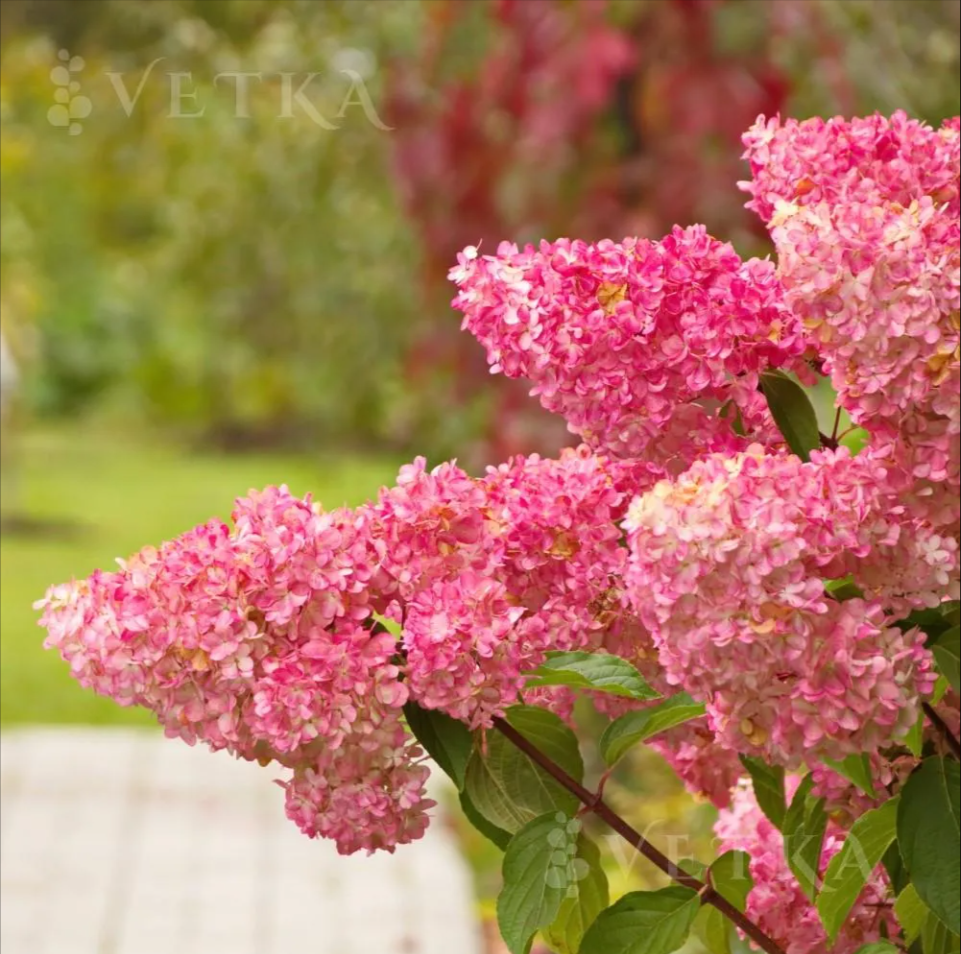 Цветение — волшебная трансформация: С июля по октябрь куст украшают огромные конические соцветия-метёлки длиной 25-35 см. Их эволюция цвета — главное шоу: начинают они кремово-белыми (ваниль), затем стремительно розовеют от основания к макушке, становясь нежно-розовыми, и к осени наливаются густым красно-клубничным и пурпурно-винным румянцем.