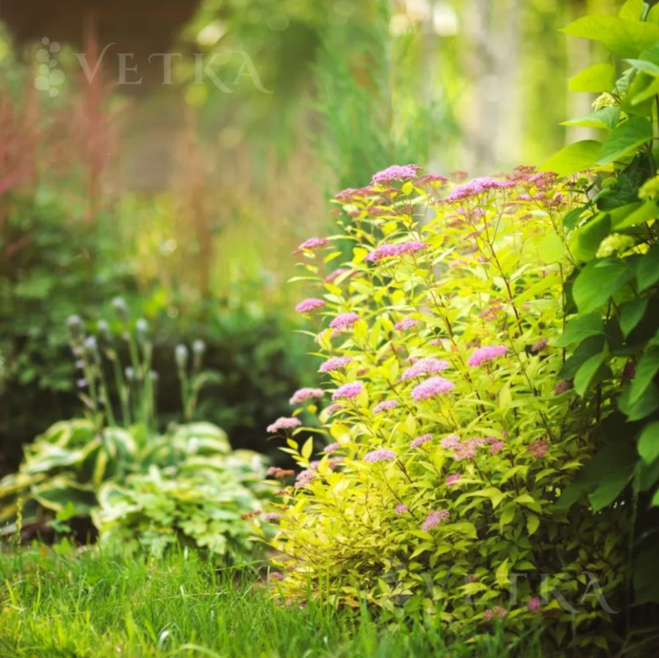 Её главное сокровище — листва сияющего, лимонно-жёлтого оттенка, которая служит идеальным фоном для нежно-розовых, ажурных соцветий. Этот сорт создан для тех, кто хочет добавить в сад свет, тепло и королевское изящество в самом компактном формате.
