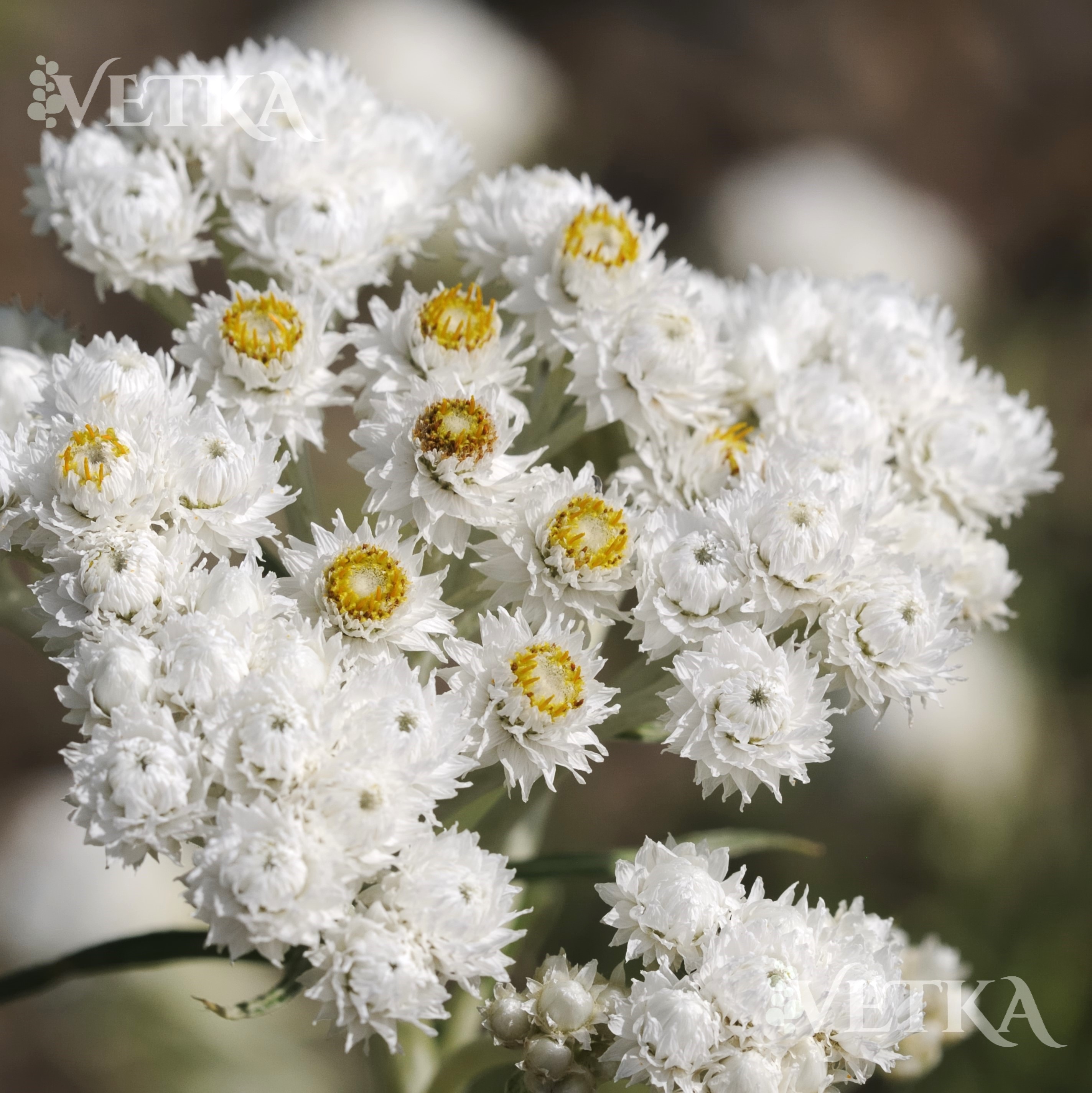 Цветки: Мелкие, жемчужно-белые "сухие" корзинки (соцветия), собранные в щитки на верхушках побегов. Сорт 'Neuschnee' ("Новый снег") отличается особенно крупными и многочисленными соцветиями по сравнению с видовым растением. Цветки идеально подходят для срезки и зимних букетов.