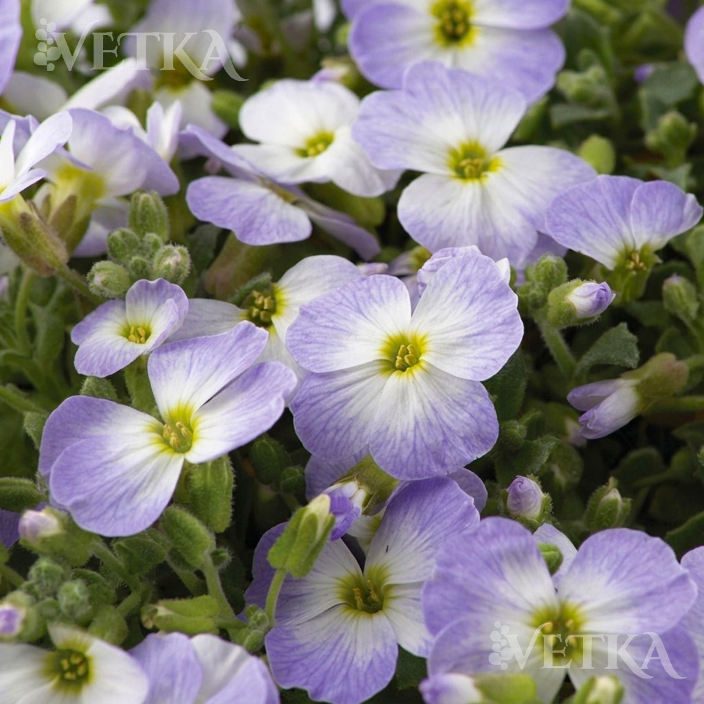 Это очаровательный вечнозеленый многолетник, образующий плотные, низкие подушковидные коврики. Растение идеально подходит для создания ярких красочных пятен в саду ранней весной. Его главная особенность — необычная двухцветная окраска цветков: насыщенные сине-фиолетовые лепестки эффектно контрастируют с чисто-белым или сиреневато-белым центром и нежными желтыми тычинками, что придает растению легкий и выразительный вид.
