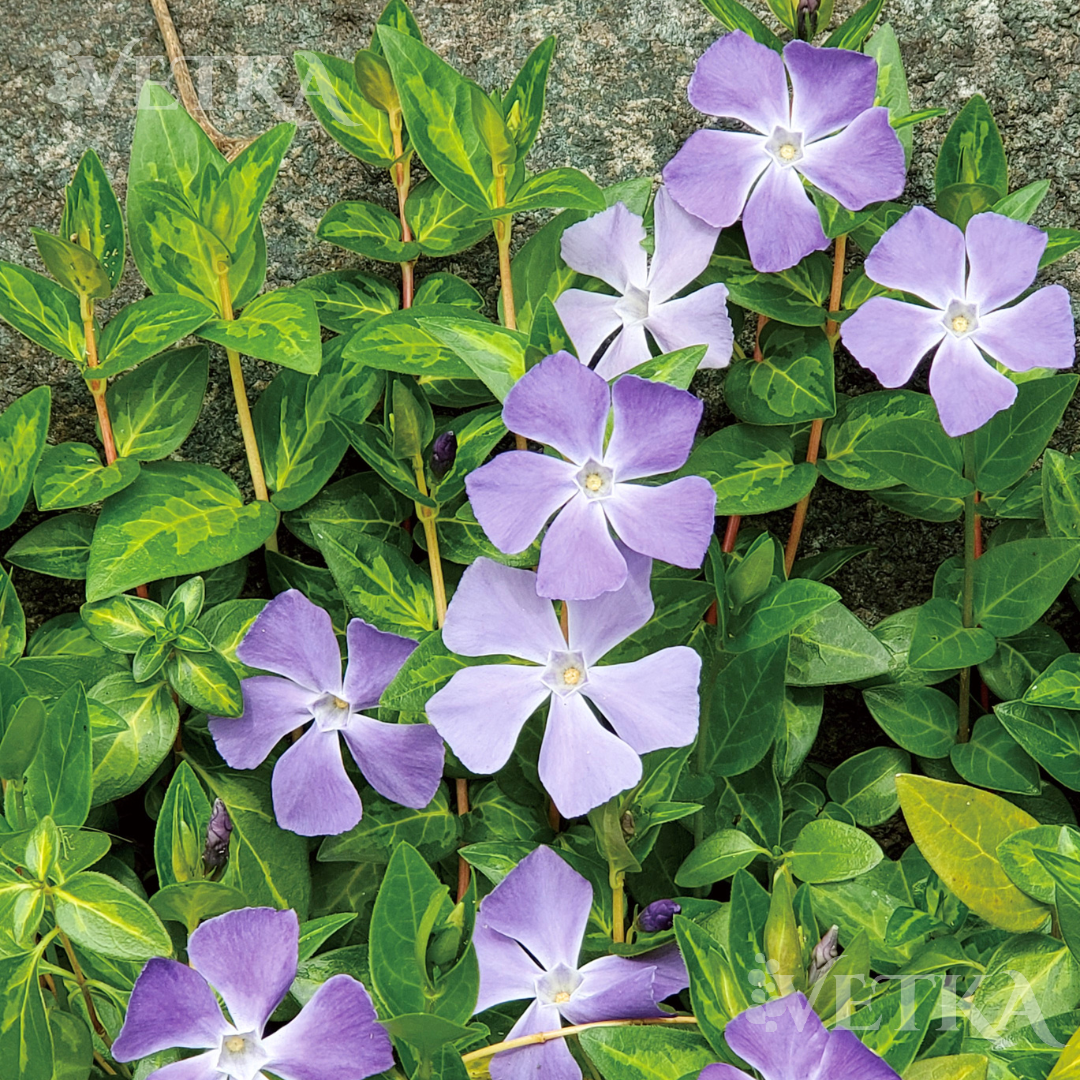 Цветки: Классические для барвинка, нежно-сиреневые или лавандово-голубые, диаметром 2-2.5 см. Появляются в апреле-мае.