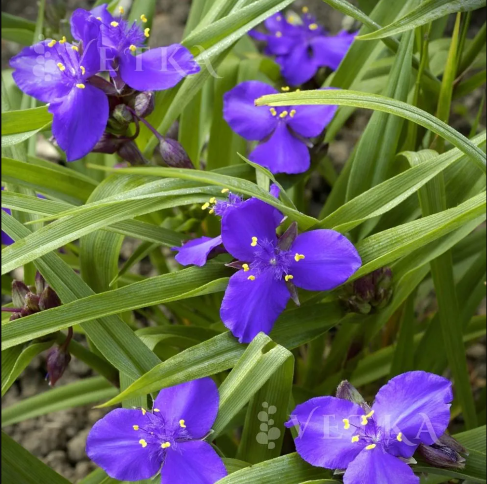 Традесканция виргинская - очаровательный многолетник с трогательными трёхлепестковыми цветками нежно-синих, фиолетовых или розовых оттенков. Образует плотные куртины высотой 40–60 см с узкими ланцетными листьями, сохраняющими свежесть весь сезон.
